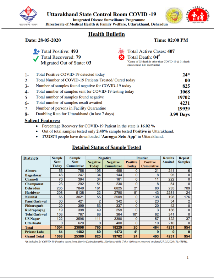 उत्तराखंड में कोरोना वायरस के मामले लगातार बढ़ते जा रहे है। स्वास्थ्य विभाग द्वारा 2 बजे तक जारी बुलेटिन के अनुसार प्रदेश में आज अब तक 24 मरीजों में कोरोना संक्रमण की पुष्टि हुई है। जिसके बाद प्रदेश में कोरोना संक्रमितों की संख्या 493 पहुंच गई है। प्रदेश में आज अब तक देहरादून जनपद से 6, हरिद्वार से 8, टिहरी से 10 पॉजिटिव केस सामने आए हैं। प्रदेश में अब तक 79 लोग स्वस्थ हो चुके है़, जबकि 4 कोरोना संक्रमित मरीजों की मौत हो चुकी है। वहीं 407 एक्टिव केस हैं।