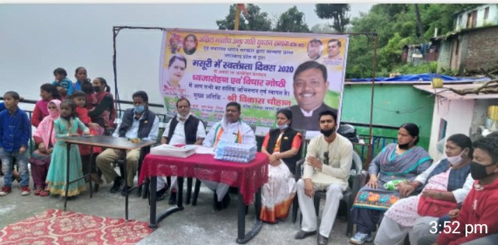 मसूरी 15 अगस्त =( प्रयास उतरांखड) अखिल भारतीय अनुसूचित जाति युवजन समाज रजिस्टर्ड शाखा मसूरी सीफन कोट बस्ती की ओर से स्वतंत्रता दिवस राष्ट्रीय पर्व के उपलक्ष में सीफन कोट बस्ती में ध्वजारोहण कार्यक्रम एवं विचार गोष्ठी का आयोजन किया गया जिसमें मुख्य अतिथि के रुप में युवजन समाज संगठन के प्रदेश अध्यक्ष सांसद प्रतिनिधि विकास चौहान ने शिरकत की एवं ध्वजारोहण किया