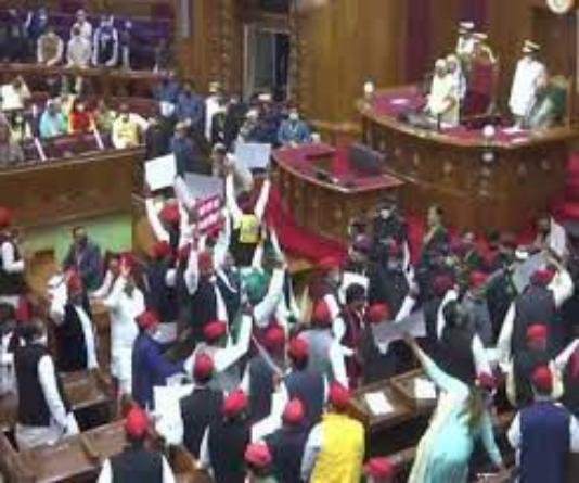 विधान सभा मंडप में समवेत सदन में राज्यपाल आनंदीबेन का अभिभाषण शुरू होते ही समाजवादी पार्टी के सदस्य हाथों में सरकार विरोधी नारे लिखी तख्तियां लेकर नारेबाजी तथा हंगामा करने लगे। यह लोग वेल में आ गए और नारा लगाने लगे। राज्यपाल वापस जाओ के नारे लगने के बीच में भी राज्यपाल आनंदीबेन का भाषण जारी है। नेता विरोधी दल अखिलेश यादव भी खड़े होकर अपनी पार्टी के विधायकों का हंगामा देख रहे थे। सदन में समाजवादी पार्टी के साथ ही राष्ट्रीय लोकदल के विधायक भी काफी हंगामा कर रहे हैं। सदन में यह लोग अभिभाषण के दौरान राज्यपाल वापस जाओ के नारे लगा रहे हैं। सपा तथा आरएलडी विधायक वेल में प्रदर्शन कर रहे हैं। यह सभी महंगाई, कानून व्यवस्था भ्रष्टाचार पर सरकार को घेर रहे हैं। इनका विरोध सदन के अंदर से लेकर बाहर तक चल रहा है।