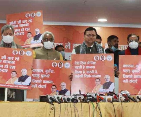 विधानसभा चुनाव के लिए भाजपा ने बुधवार से अपने चुनाव प्रचार अभियान की विधिवत शुरुआत कर दी। हरिद्वार रोड स्थित भाजपा के मीडिया सेंटर में आयोजित पत्रकार वार्ता में मुख्यमंत्री पुष्कर सिंह धामी ने प्रचार अभियान के लिए ‘किया है, करती है, करेगी सिर्फ भाजपा ‘ नारा लांच किया। धामी के साथ ही भाजपा के प्रदेश अध्यक्ष मदन कौशिक, पूर्व मुख्यमंत्री रमेश पोखरियाल निशंक, त्रिवेंद्र सिंह रावत व तीरथ सिंह रावत ने यह नारा लिखे विभिन्न पोस्टर भी जारी किए।