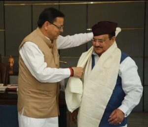 प्रयास उत्तराखंड न्यूज : मुख्यमंत्री श्री पुष्कर सिंह धामी ने शुक्रवार को नई दिल्ली में भारतीय जनता पार्टी के राष्ट्रीय अध्यक्ष श्री जे. पी नड्डा से शिष्टाचार भेंट की और जन्म दिवस की शुभकामना दी। इस अवसर पर मुख्यमंत्री ने भाजपा के राष्ट्रीय अध्यक्ष को कंडाली से निर्मित शॉल एवं पहाड़ी टोपी भेंट की।