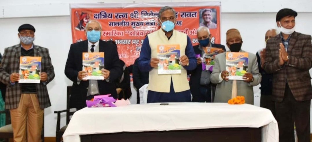 मुख्यमंत्री श्री त्रिवेन्द्र सिंह रावत ने रविवार को मुख्यमंत्री श्री त्रिवेन्द्र सिंह रावत ने रविवार को मुख्यमंत्री आवास में क्षत्रिय चेतना मंच की स्मारिका के 12 वें अंक ‘क्षत्रिय संदेश’ का विमोचन किया। क्षत्रिय चेतना मंच द्वारा स्मारिका के माध्यम से इतिहास को संजोने के साथ ही समाज के हर वर्ग को जागरूक करने का प्रयास किया गया है। उन्होंने कहा कि क्षत्रिय चेतना मंच द्वारा सीमित संसाधन होते हुए भी समय-समय पर जन जागरूकता के कार्यक्रम चलाये जाते हैं। स्वयं सेवी भाव से लोगों की मदद की जा रही है। कोरोना काल में भी क्षत्रिय चेतना मंच द्वारा लोगों की हर संभव मदद की गई।