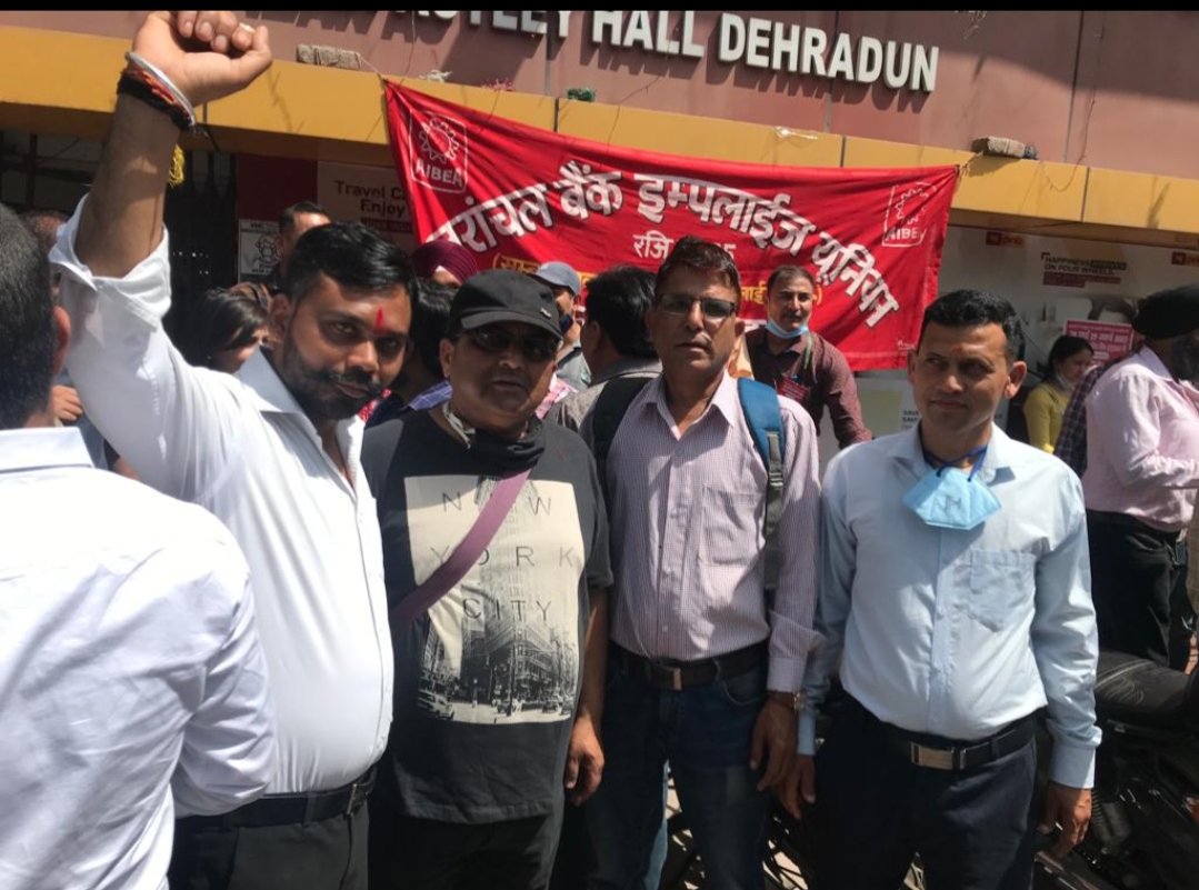प्रयास उत्तराखंड( दीपक धीमान )देहरादून: दिनांक 28.03.2022 को ए.आई.बी.ई.ए. से सम्बद्ध कर्मचारियों ने दो दिवसीय राष्ट्रीय आम हड़ताल में हिस्सा लिया। सभी कर्मचारी पी.एन.बी. एस्ले डाल के समक्ष उपस्थित हुये तथा अपनी मांगों के सम्बन्ध में नारेबाजी व अपने विचार व्यक्त किये। बैंक कर्मचारियों ने अपनी निम्नलिखित मांगों के समर्थन में दो दिवसीय हड़ताल में जाने overline ab T निर्णय लिया :