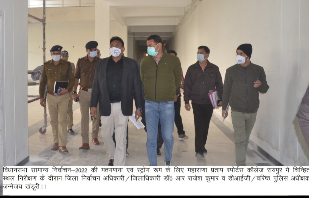 देहरादून दिनांक 15 जनवरी 2022 (जि.सू.का), जिला निर्वाचन अधिकारी/जिलाधिकारी डॉ0 आर राजेश कुमार व डीआईजी/वरिष्ठ पुलिस अधीक्षक जन्मेजय खंडूरी ने रायपुर स्थित महाराणा प्रताप स्पोर्ट्स कॉलेज में बनाये जाने वाले मतगणना केंद्र एवं स्ट्रोंग रूम हेतु चिन्हित हाॅल/कक्षों का निरीक्षण किया। उन्होंने संबंधित अधिकारियों को मतगणना के दौरान सभी तैयारियों को समय से पूर्ण करने के निर्देश दिए।