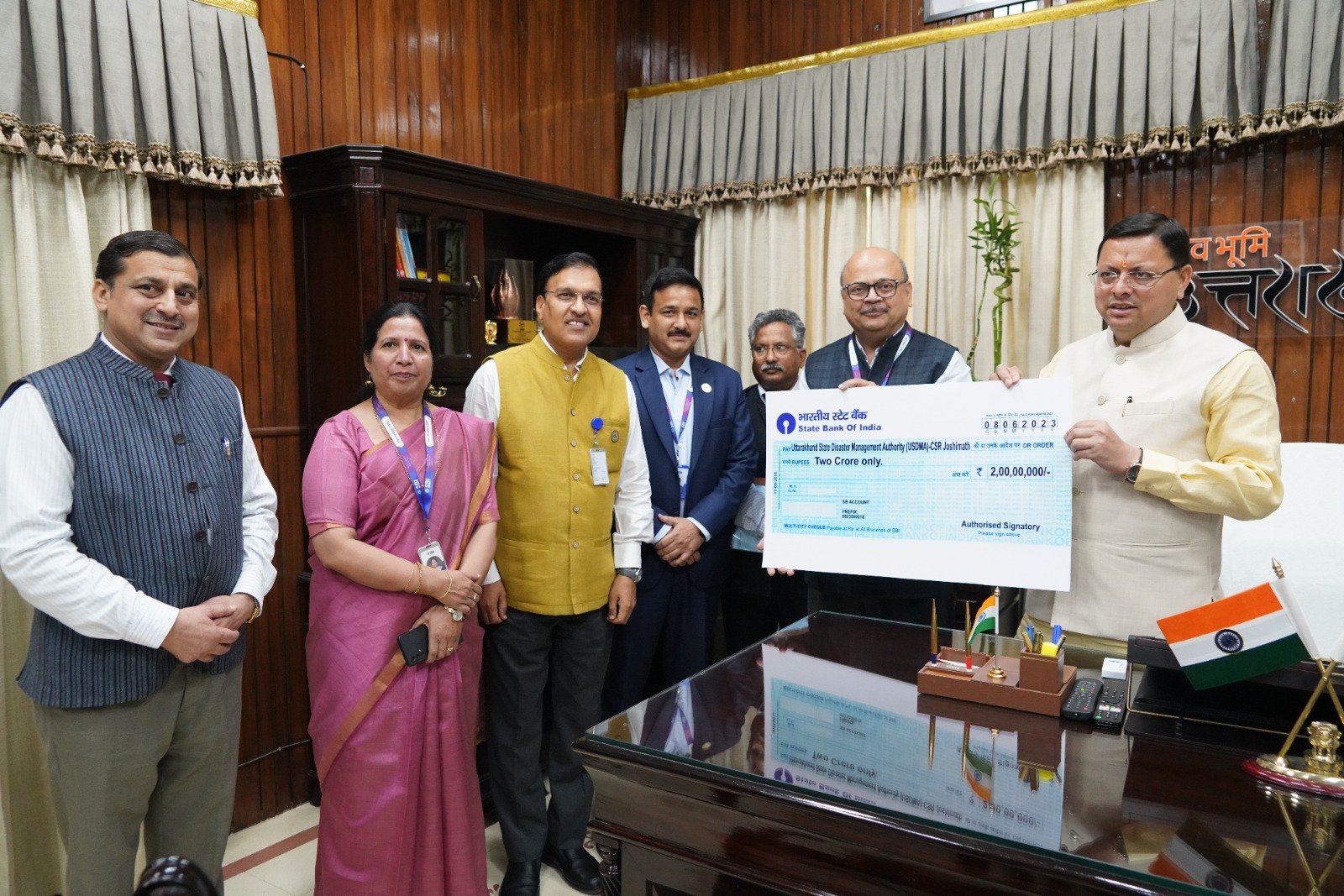 मुख्यमंत्री श्री पुष्कर सिंह धामी से मुख्यमंत्री कैम्प कार्यालय में भारतीय स्टेट बैंक, नई दिल्ली मण्डल के मुख्य महाप्रबंधक श्री कल्पेश कृ. अवासिया ने भेंट कर 02 करोड़ रूपये का चेक सौंपा। मुख्यमंत्री ने प्रभावितों की सहायता के लिए इस सहयोग राशि के लिए भारतीय स्टेट बैंक का आभार व्यक्त किया। मुख्यमंत्री ने कहा कि राज्य के चिन्हित चार वाइब्रेंट विलेज माणा, नीति , मलारी एवं गूंजी में अवस्थापना विकास से संबंधित अनेक कार्य किये जाने हैं, इसके लिए भी उन्होंने एस.बी.आई से सहयोग की अपेक्षा की।