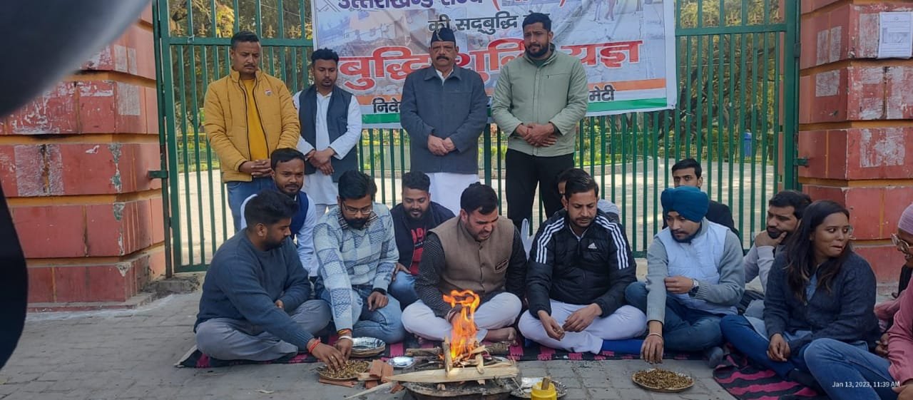 जोशीमठ भू-धसाव प्रकरण पर उत्तराखण्ड राज्य सरकार के मुख्यमंत्री/मंत्री/अधिकारियों के सुस्त रवैये एवं आये दिन सरकार द्वारा भर्ती परीक्षाओं में युवाओं के साथ हो रही धांधली पर महानगर देहरादून युवा कांग्रेस अध्यक्ष सिद्धार्थ वर्मा के नेतृत्व में आज देहरादून स्थित गांधी पार्क में सरकार की बुद्धि शुद्धि हेतु यज्ञ कार्यक्रम का आयोजन किया गया।