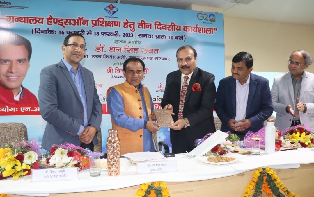 उच्च शिक्षा मंत्री डॉ0 धन सिंह रावत ने आज दून विश्वविद्यालय देहरादून में उच्च शिक्षा विभाग एवं एनआईसी भारत सरकार के सहयोग से आयोजित तीन दिवसीय ई-ग्रंथालय हैण्ड्सऑन प्रशिक्षण कार्यशाला का शुभारम्भ किया। इस मौके पर डॉ0 रावत ने कहा कि आने वाला समय डिजिटल एजुकेशन का है। हमें भी खुद को इसी के अनुरूप तैयार करना होगा। उन्होंने कहा कि सूबे के सभी राजकीय विश्वविद्यालयों एवं महाविद्यालयों में ई-ग्रंथालय की स्थापना कर दी गई है, जिसमें 21 लाख से अधिक पुस्तकें उपलब्ध हैं, लेकिन इनका अध्ययन करने वाले छात्र-छात्राओं की संख्या अभी काफी कम है। उन्होंने अधिकारियों को निर्देश दिये कि एक माह के भीतर सूबे के सभी राजकीय शिक्षण संस्थानों में अध्ययनरत शतप्रतिशत छात्र-छात्राओं का ई-ग्रंथालय में पंजीकरण सुनिश्चित करें। ई-ग्रंथालय में पंजीकरण के उपरांत छात्र-छात्राओं को कैटलॉगिंग की आधुनिक डिजिटल सुविधा के साथ-साथ देश के अन्य विश्वविद्यालयों एवं महाविद्यालयों में उपलब्ध पुस्तकों, शोध पत्र-पत्रिकाओं सहित अन्य पठन-पाठ्न की सामग्री आसानी से उपलब्ध रहेगी। उन्होंने कहा कि यदि किसी संस्थान में छात्र-छात्राओं का पंजीकरण का कार्य पूरा नहीं होता है तो इसके लिये संबंधित संस्थान के प्राचार्य एवं पुस्तकालयाध्यक्ष को जिम्मेदार माना जायेगा। डॉ0 रावत ने कहा कि भविष्य में ई-ग्रंथालय में एनईपी-2020 के अनुरूप तैयार नये पाठ्यक्रम की पुस्तकों के साथ ही विभिन्न विषय विशेषज्ञों के शोध पत्रों व उच्च शिक्षा में तैनात शिक्षकों की उपयुक्त पुस्तकों को भी अपलोड किया जायेगा ताकि छात्र-छात्राओं को विभिन्न विषयों की अध्ययन सामग्री आसानी से उपलब्ध हो सके। विभागीय मंत्री ने कहा कि विभिन्न महाविद्यालयों के पुस्तकालयों में हजारों ऐसी पुस्तक उपलब्ध है जो अब आउट ऑफ सिलेबस हो चुकी है। ऐसी पुस्तकों को वन टाइम सेटेलमेंट के तहत किसी जरूरतमंद अथवा सार्वजनिक पुस्तकालयों को दान की जायेंगी, पुरानी पुस्तकों के स्थान पर शिक्षण संस्थानों में नवीन पाठ्यक्रम के अनुरूप अच्छे लेखक एवं प्रकाशकों की पुस्तकें खरीदी जायेंगी।