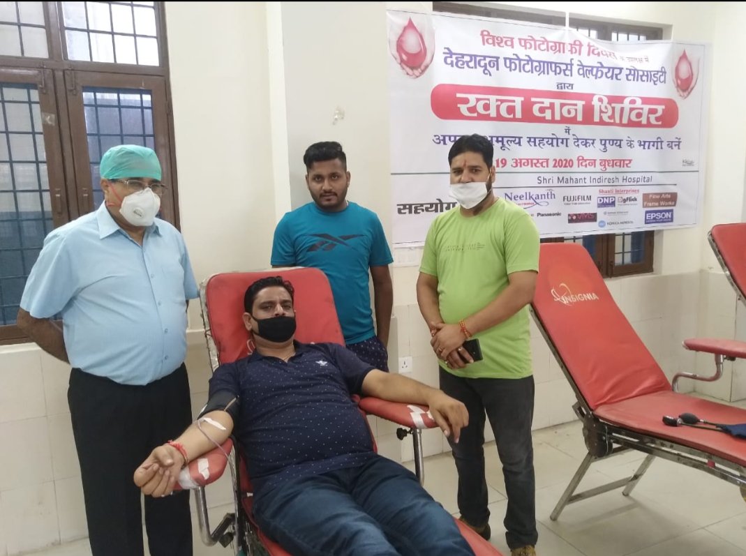 प्रयास उत्तराखंड दिनांक 19 अगस्त 2020 को “विश्व फोटोग्राफी दिवस” पर देहरादून फोटोग्राफर्स वेल्फेयर सोसायटी ए एक रक्त दान शिविर लगाया गया जिसमें देहरादून के अधिकतर फोटोग्राफर्स व अन्य लोगो ने भाग लिया,